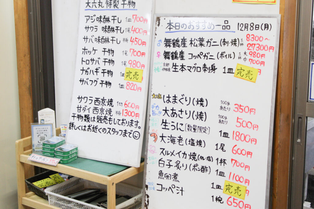 大六丸特製の干物や季節限定メニューなど、海鮮好きにはたまらないメニューが並びます。