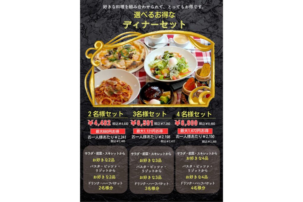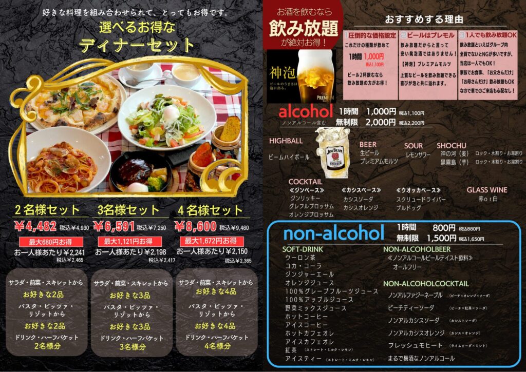夜はお得にテーブルが華やかになる『ディナーセット』と『飲み放題』がおすすめ!
