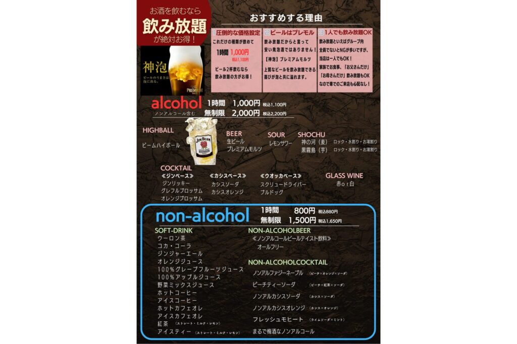 また、1時間1,000円を選んだ場合ビール2杯(プレミアムモルツ)で元が取れる良心価格!さらに、2,000円の飲み放題は時間無制限に!