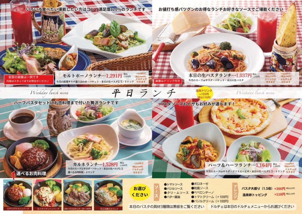 平日ランチは5種類。平日ランチのパスタは、本日の具材に合わせて自分で約9種類のソースから選ぶことができます。ランチコースのパスタはグランドメニューから選べます。