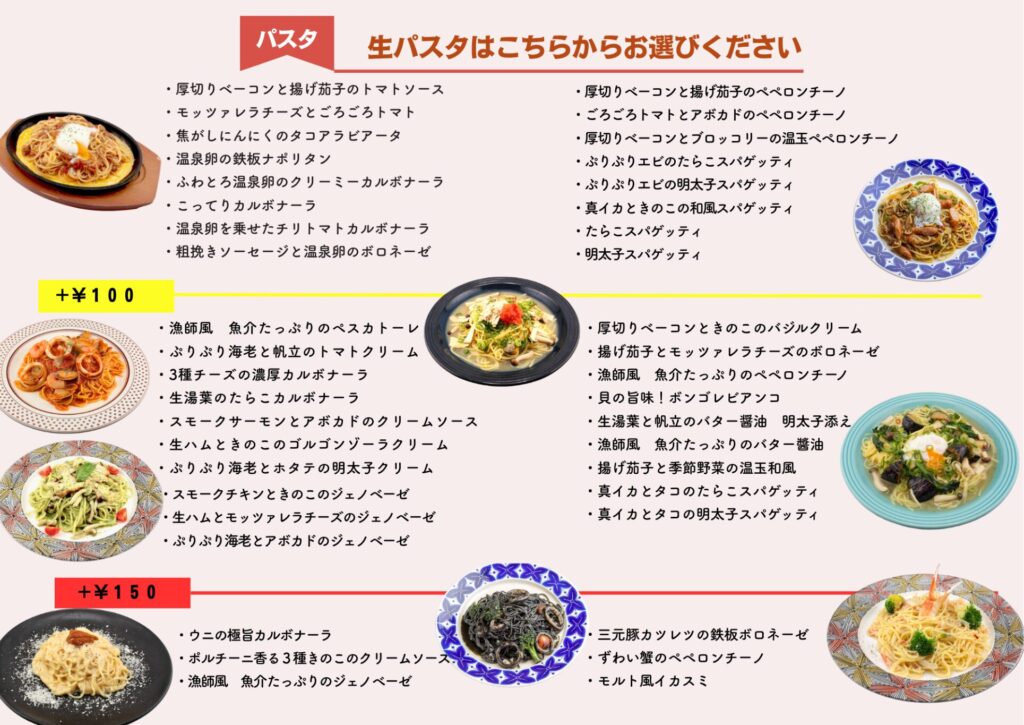 パスタのラインナップの多さも、モルトボーノの大きな魅力です。季節ごとに登場する期間限定メニューに加え、グランドメニューだけでも43種類。